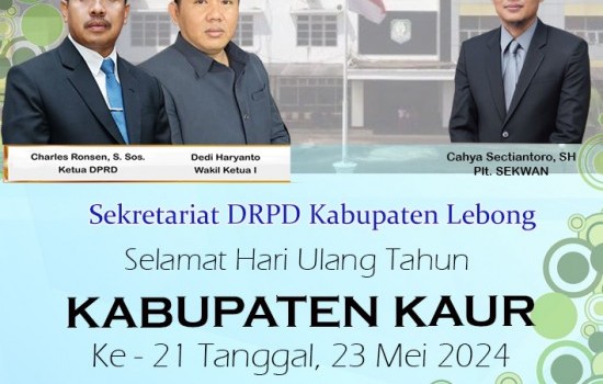Sekretariat DPRD Kabupaten Lebong mengucapkan Selamat HUT Kabupaten Kaur ke -21 Tahun 2004. “ Terus Berkarya untuk Kabupaten Kaur yang Lebih Baik, Unggul, Maju dan Sejahtera “